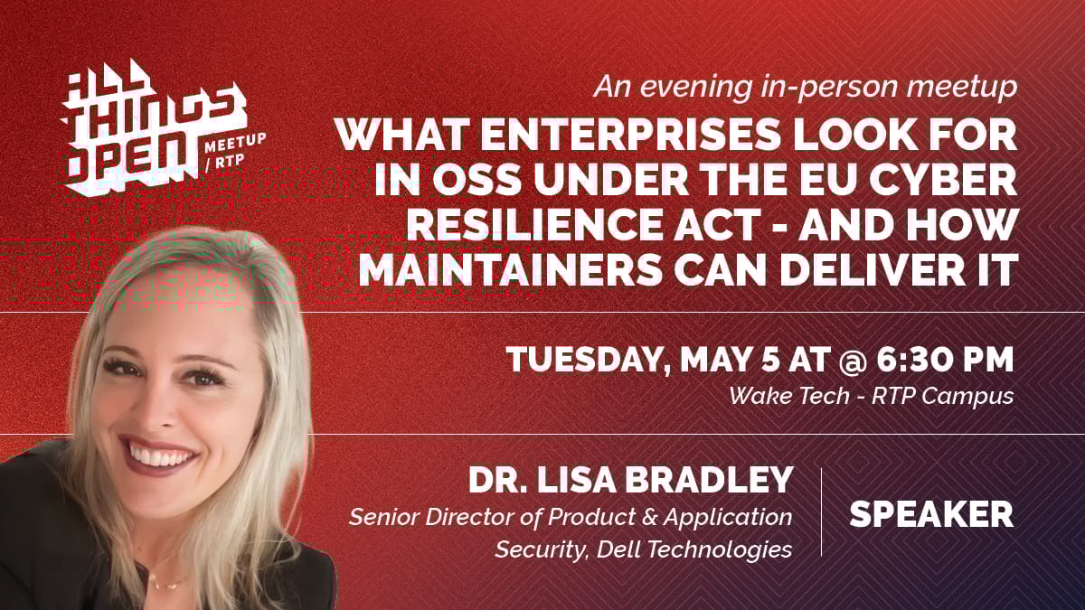 We're hosting our first in-person meetup since the uber-successful All Things AI conference last month on Tuesday evening, May 5. The topic - What Enterprises Look for in OSS Under the EU Cyber Resilience Act — and How Maintainers Can Deliver It, is a unique and important one. The speaker, Dr. Lisa Bradley, Senior Director of Product & Application Security at Dell Technologies, is world-class and will deliver a ton of value to attendees. RSVP today and save your spot! Seating is limited.